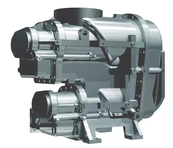 • 雙電機獨立驅動,每級壓縮比相比單級壓縮降低,轉子間泄漏回流大大降低,產氣量增加;